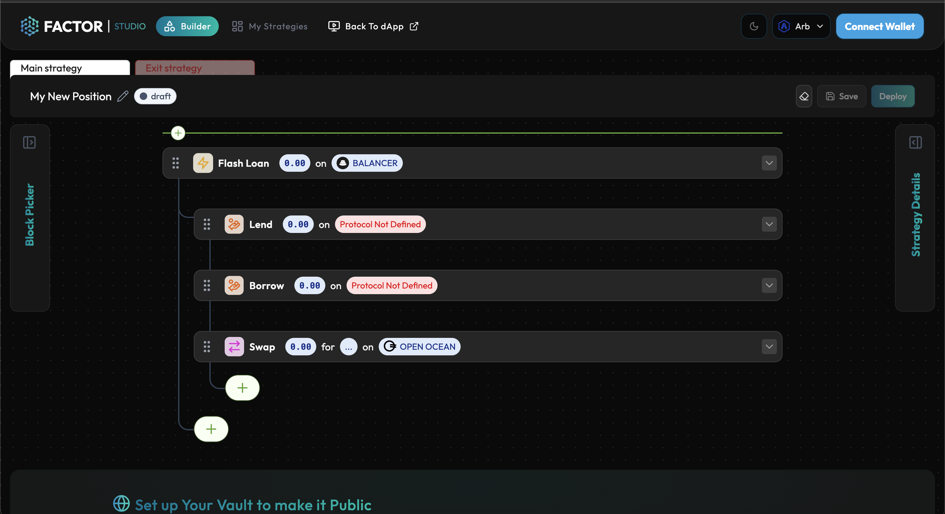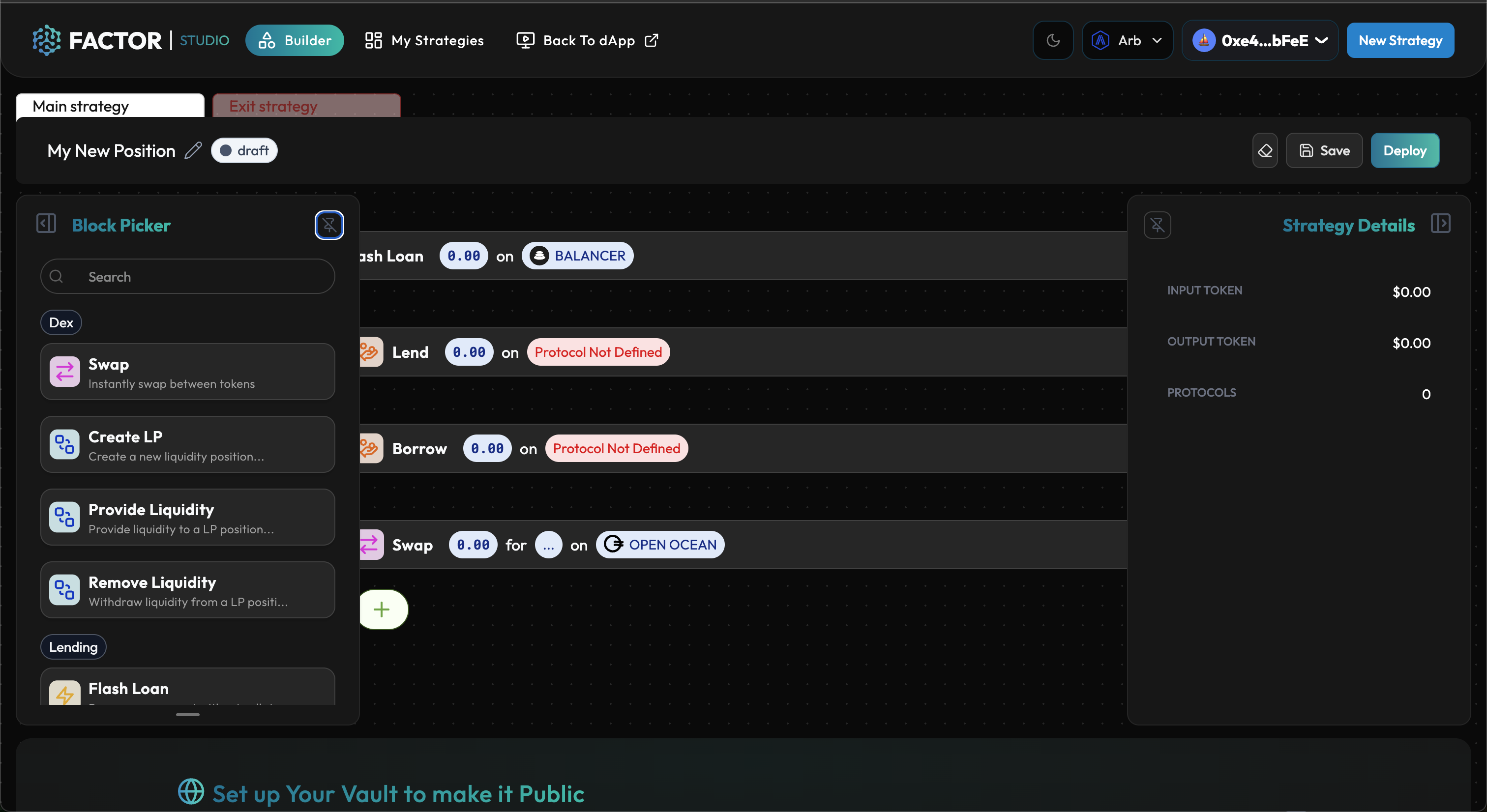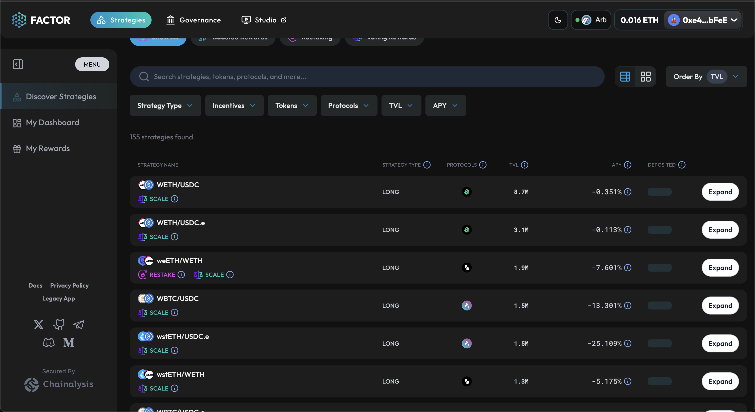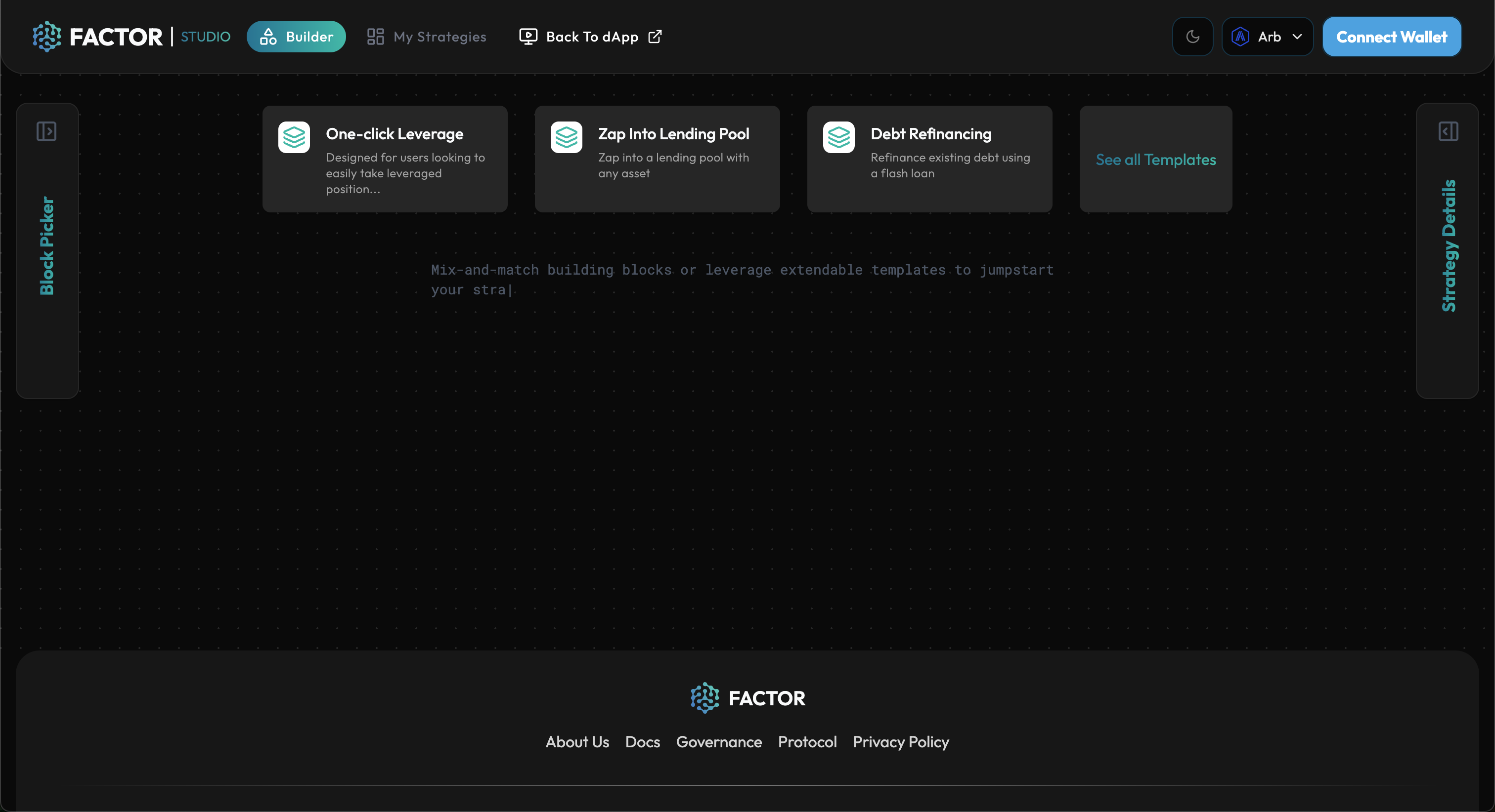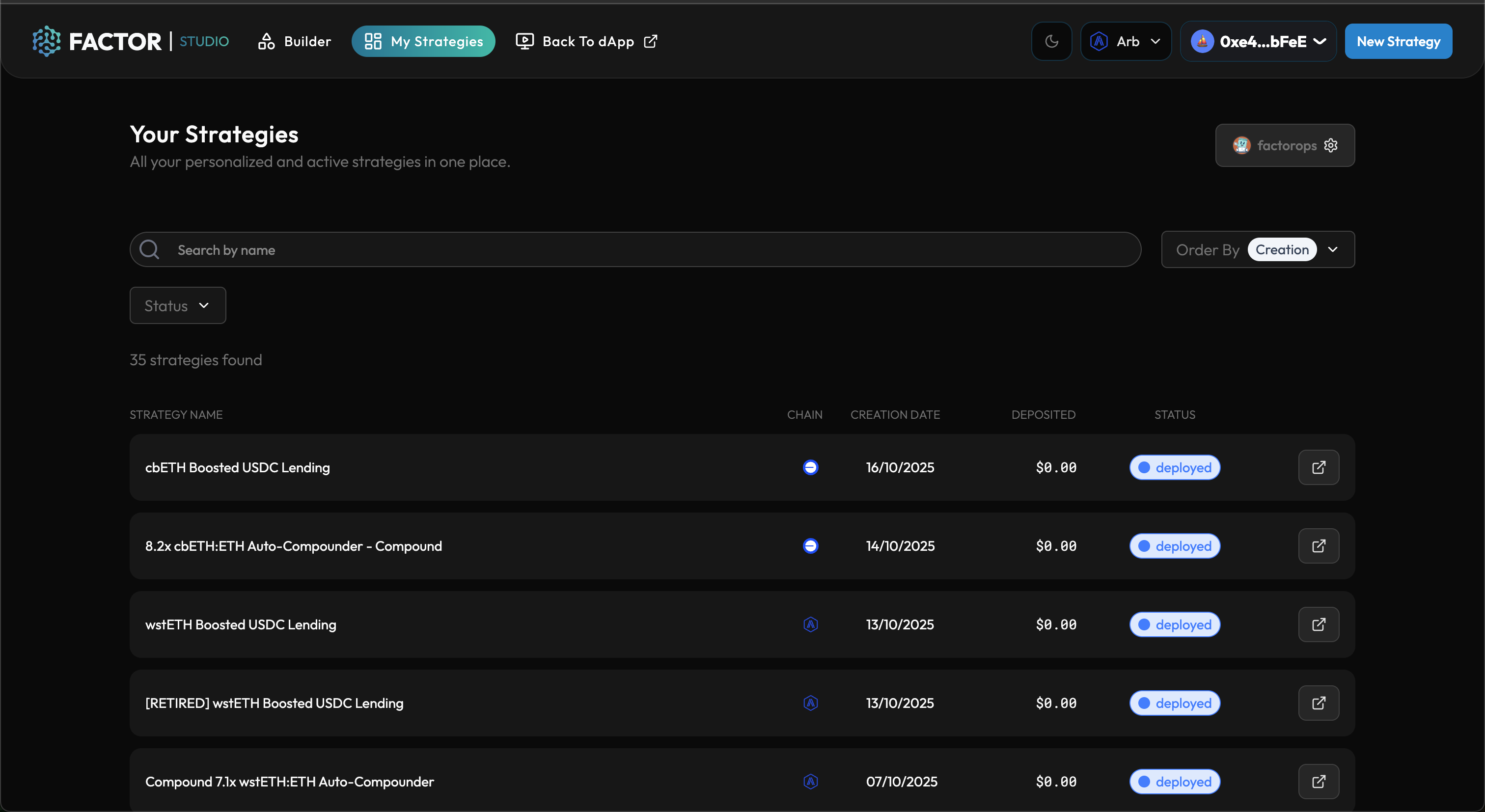 Factor DApp and Factor Studio are comprehensive DeFi platforms for creating and automating yield strategies. The platform features a drag-and-drop strategy builder and modular frontend architecture for scalable DeFi operations.