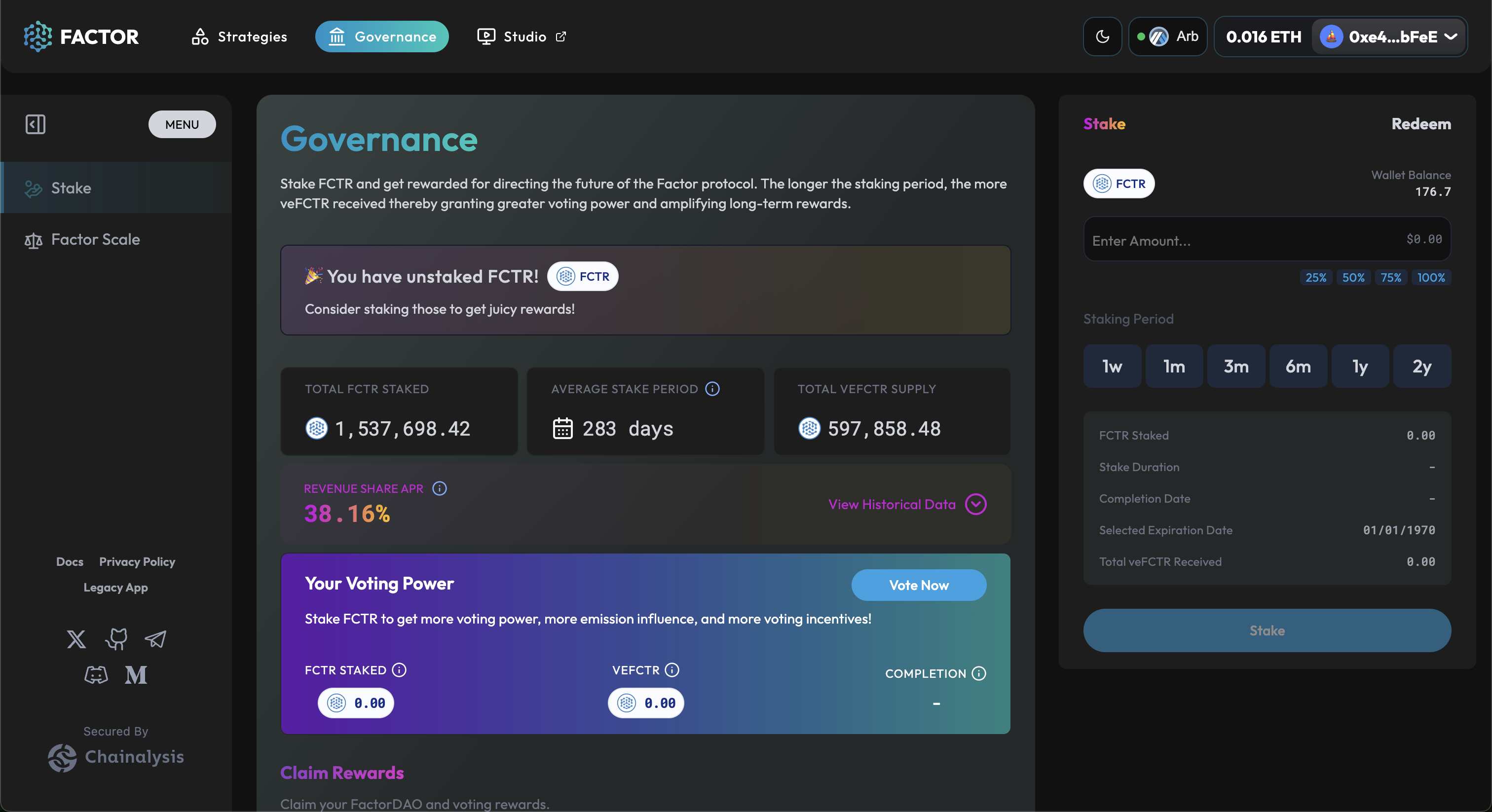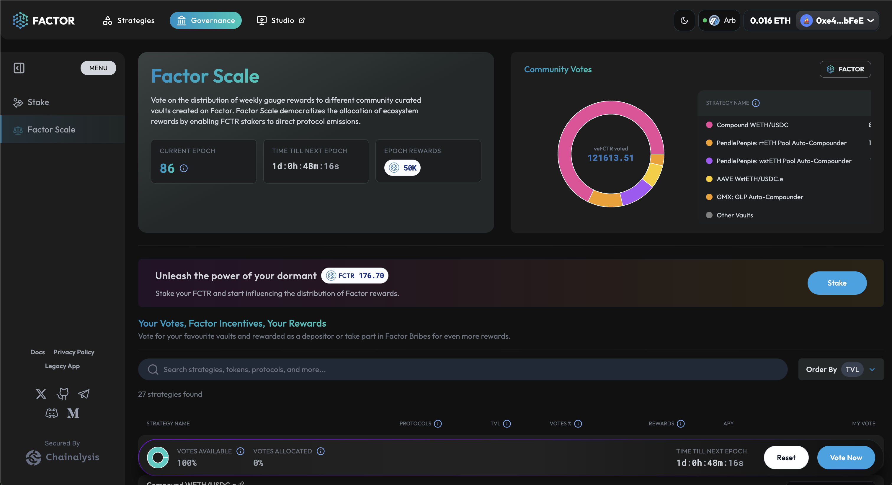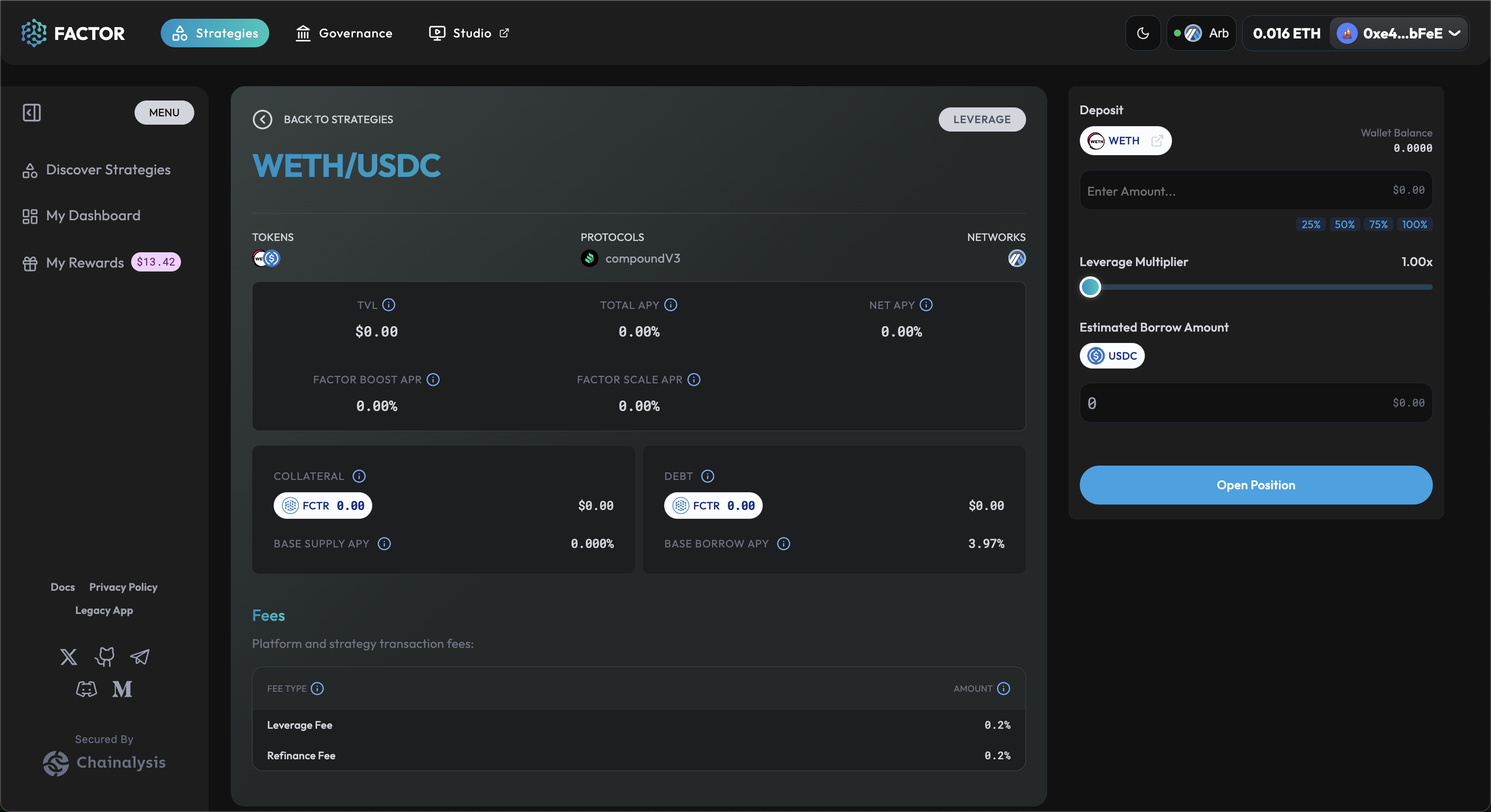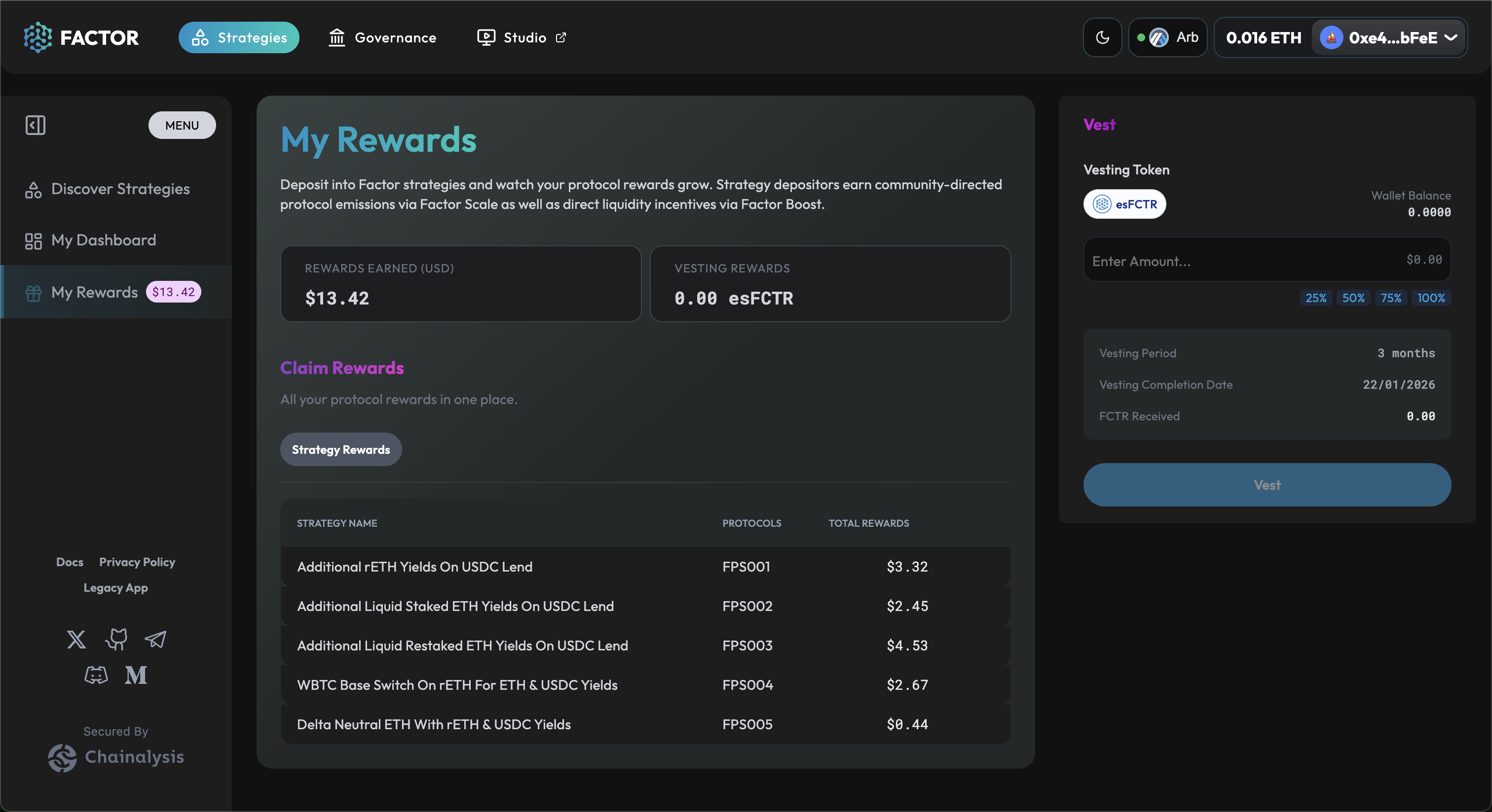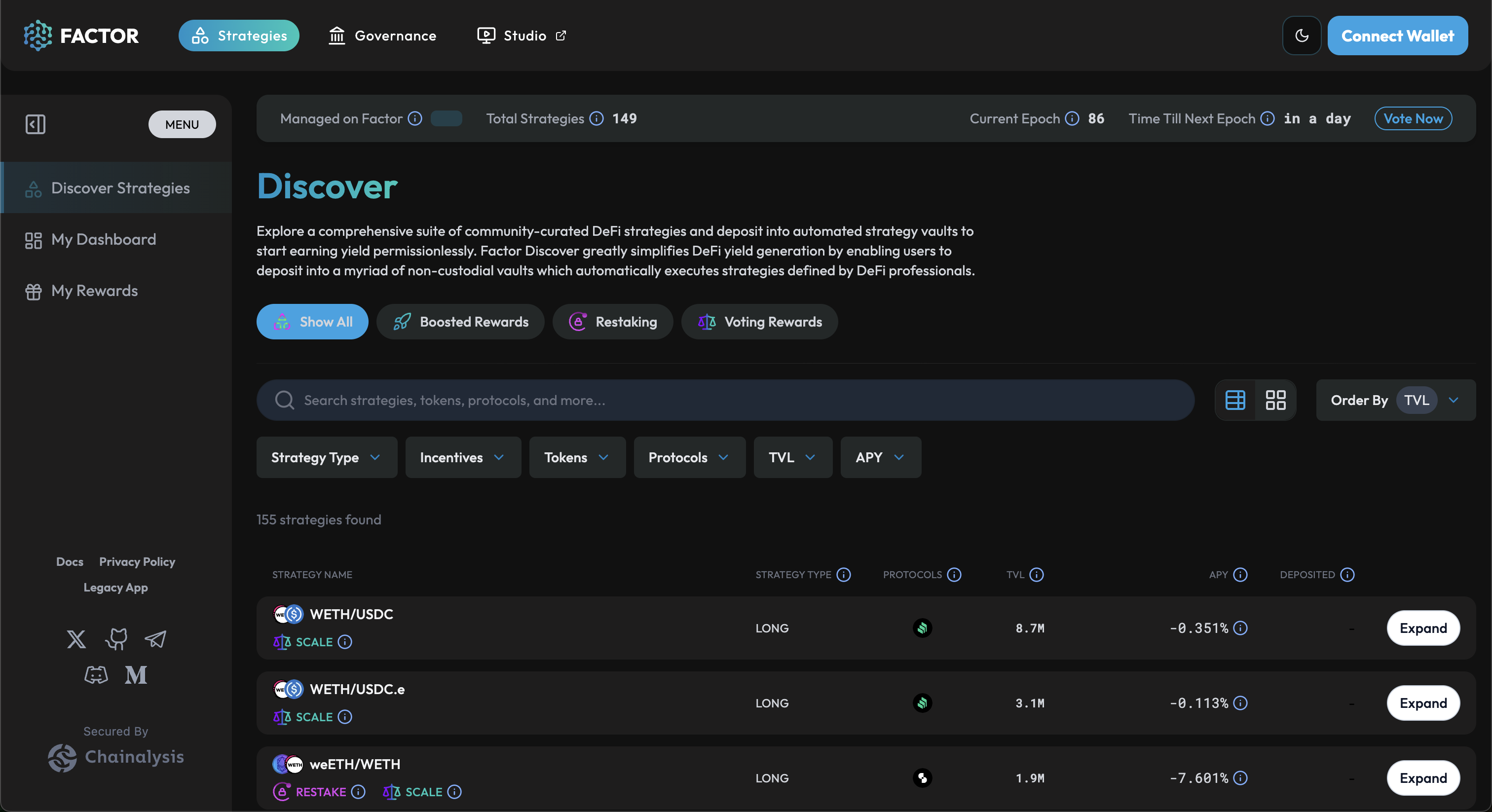 Factor DApp and Factor Studio are comprehensive DeFi platforms for creating and automating yield strategies. The platform features a drag-and-drop strategy builder and modular frontend architecture for scalable DeFi operations.
